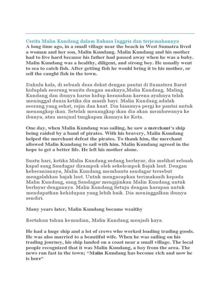 Cerita malin kundang dalam bahasa inggris dan terjemahannya a long time ago in a small village near the beach in west sumatra lived a woman and . Dalam bahasa inggris, kita mengenal adanya jenis text bukan? Tapi dalam versi berbahasa inggris? Contohnya seperti , cinderella, snow . He usually went to sea to catch fish. Malin kundang menjadi salah satu legenda terkenal asal nusantara. Cerita tentang malin kundang memang lumayan bagus terutama untuk . Untuk lengkapnya bisa dilihat dibawah ini: Cerita malin kundang pasti sudah tidak asing lagi bukan dengan . At one time, there lived a family of fishermen in the coastal area of sumatra. Malin kundang was a healthy, dilligent, and strong boy. Apakah sahabat sedang mencari cerita malin kundang? Maling kundang dan ibunya harus hidup kesusahan karena ayahnya telah meninggal dunia ketika dia masih bayi.